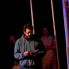 Mas a mais marcante e po-lê-mi-ca experiência... Foi em 2012, “Sustentabilidade” era o tema, falo por alguns comentários de gente que eu respeito e pela minha própria experiência. Para darmos vida a uma tribo estranha de índios, ao invés de “vestir”, nos despimos, seminus (corpos bem comuns e diversos), com pinturas indígenas sobre a pele, exposta e sensível à violência do mundo, pele crua, sob estas luzes deste espaço, caminhamos para a morte, buscando em nosso DNA, asfaltado de civilização, impermeabilizado de sentidos, impermeabilizado da chuva de sentidos, algo que ainda temos de nossos avós índios, como tinham aqueles índios que cometiam suicídio voluntário na época do genocídio dos Guaranis Kaiowás em 2012. Caminhamos até a frente do público, um a um, e éramos mortos instantaneamente pelo olhar de cada um da plateia, formando uma pilha de índios mortos que em seguida renascia como árvores e gravetos, compondo uma mata densa, vagina de onde nasceu Macunaíma para contar aquela história. História muito doida (um herói mau caráter e sua nação, condenados à sede e socorridos pelos personagens do folclore brasileiro, cuja única arma que tinham eram estilingues carregados de pedras invisíveis apontadas ao público) muitos de nós também não compreendíamos racionalmente e não sabíamos explicar tão claramente. Mas um chamado tão forte que dialogou conosco e não tínhamos dúvidas ou receios, pois sentíamos que aquilo era nosso. O Flávio sonhava em contar esta história outras vezes e nós também, porém aquele ciclo se fechou. Mas afinal o que acaba? O que realmente acaba? Será que esta peça que assistimos aqui acabou mesmo? Ainda vive em nós, com a honra e o prazer deste encontro que é uma referência forte para mim de como é bom e arriscado ter coragem de permitir que os fluxos de nossa essência se esvaiam, é cada vez mais raro, cada vez mais necessário.